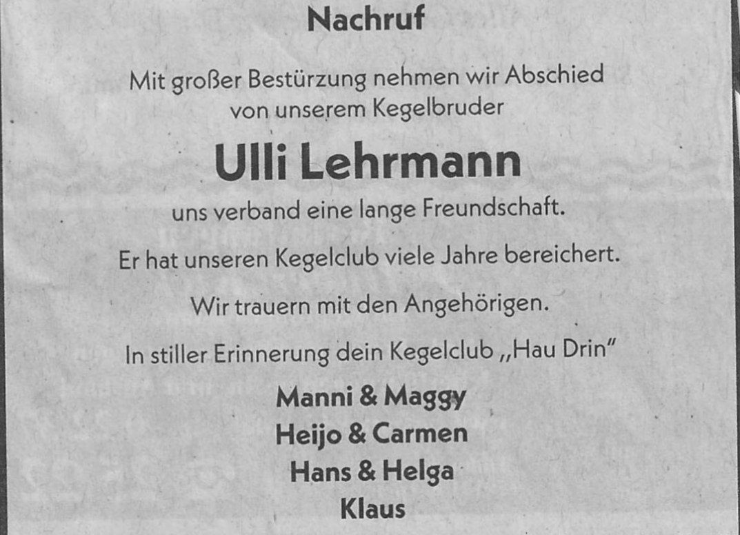 Lieber Ulli, wir haben Dich die letzten 104 Tage deines Lebens begleitet. Gerne hätten wir dich noch bei uns gehabt. Du warst immer für mich wie ein größerer Bruder und mein Lieblingsonkel und hast auch Silda, die dich immer wie einen Opa gesehen hat, innig gemocht. In Liebe Elke, Gerald, Norbert, Marliese, Silda, Maria, Haifa und Mahmmoud.