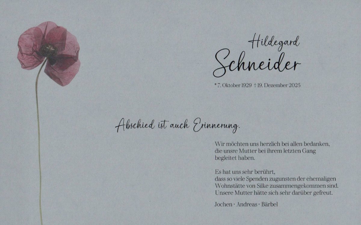 Vielleicht kann auch die eingerichtete Gedenkseite ein stiller Ort sein, an dem diese Erinnerungen bewahrt werden. Sie bietet die Möglichkeit, Gedanken, Bilder und Worte zu sammeln, die das Leben von Hildegard würdigen und lebendig halten.